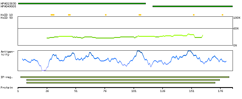 Under the antigens, the maximum percent sequence identity of the protein to all other proteins from other human genes is displayed, using a sliding window of 10 aa residues (HsID 10) or 50 aa residues (HsID 50). The region with the lowest possible identity is always selected for antigen design, with a maximum identity of 60% allowed for designing a single-target antigen (read more).