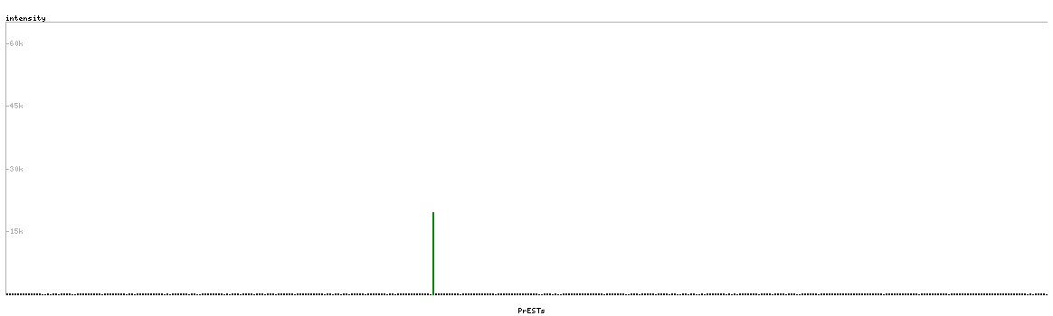 At the top of the view, the position of the antigen (identified by the corresponding HPA identifier) is shown as a green bar. A yellow triangle on the bar indicates a <100% sequence identity to the protein target.