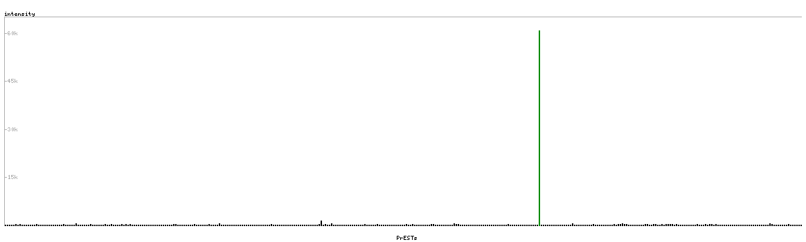 At the top of the view, the position of the antigen (identified by the corresponding HPA identifier) is shown as a green bar. A yellow triangle on the bar indicates a <100% sequence identity to the protein target.