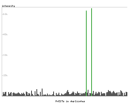 At the top of the view, the position of the antigen (identified by the corresponding HPA identifier) is shown as a green bar. A yellow triangle on the bar indicates a <100% sequence identity to the protein target.