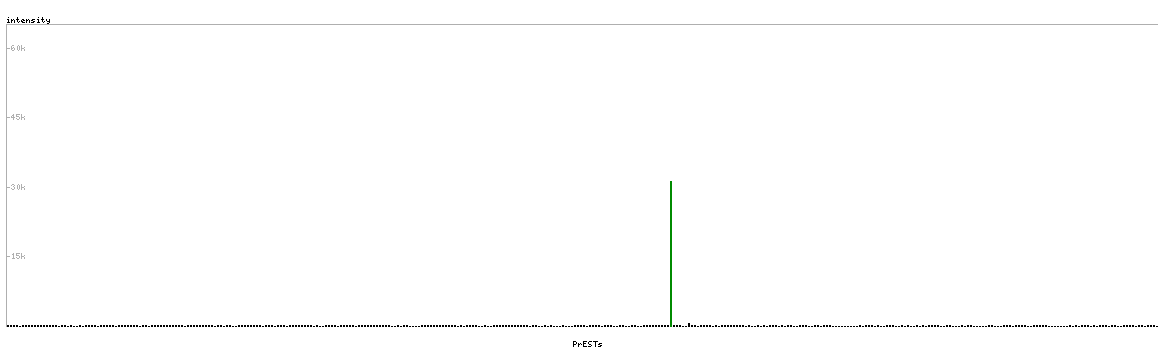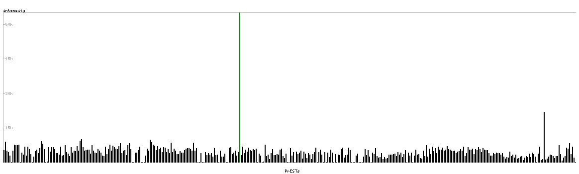 At the top of the view, the position of the antigen (identified by the corresponding HPA identifier) is shown as a green bar. A yellow triangle on the bar indicates a <100% sequence identity to the protein target.