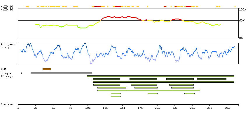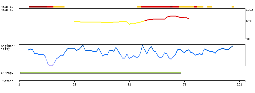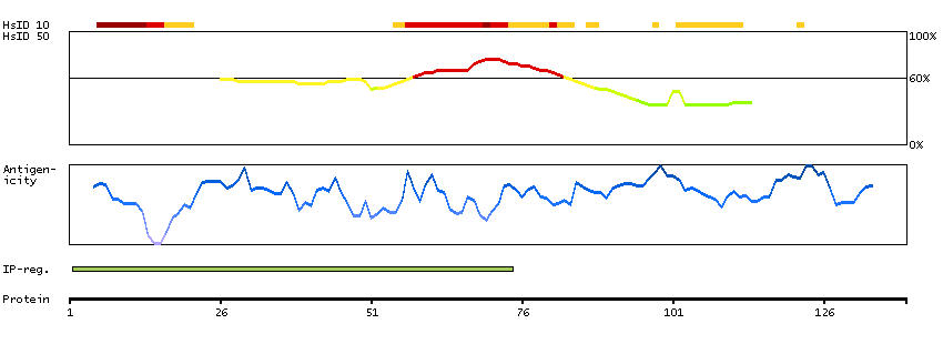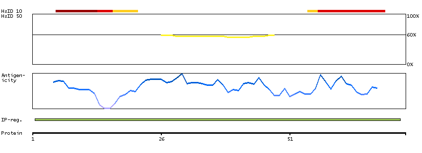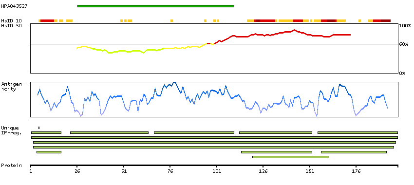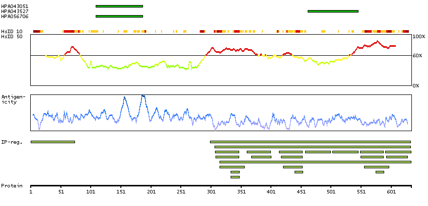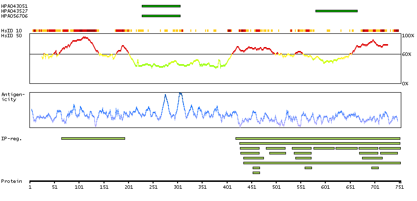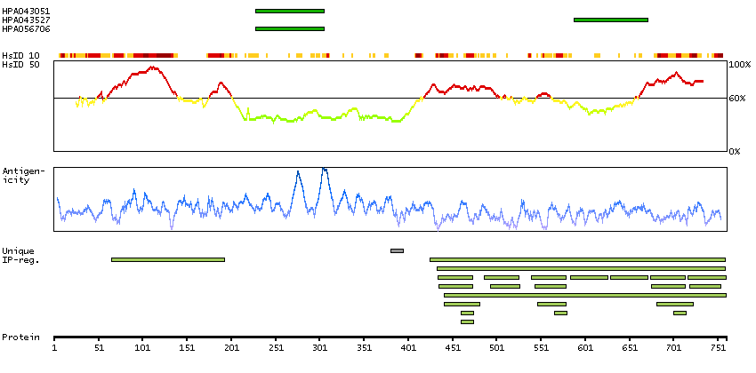 Under the antigens, the maximum percent sequence identity of the protein to all other proteins from other human genes is displayed, using a sliding window of 10 aa residues (HsID 10) or 50 aa residues (HsID 50). The region with the lowest possible identity is always selected for antigen design, with a maximum identity of 60% allowed for designing a single-target antigen (read more).