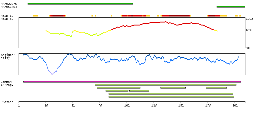 Under the antigens, the maximum percent sequence identity of the protein to all other proteins from other human genes is displayed, using a sliding window of 10 aa residues (HsID 10) or 50 aa residues (HsID 50). The region with the lowest possible identity is always selected for antigen design, with a maximum identity of 60% allowed for designing a single-target antigen (read more).