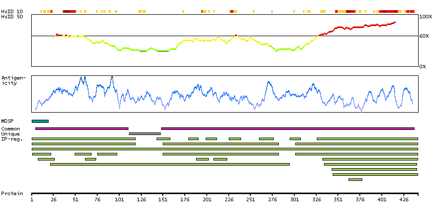 Under the antigens, the maximum percent sequence identity of the protein to all other proteins from other human genes is displayed, using a sliding window of 10 aa residues (HsID 10) or 50 aa residues (HsID 50). The region with the lowest possible identity is always selected for antigen design, with a maximum identity of 60% allowed for designing a single-target antigen (read more).