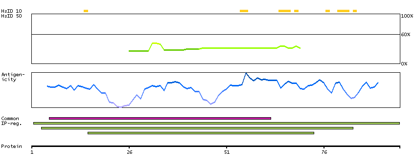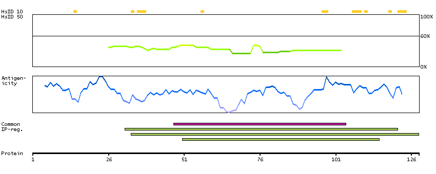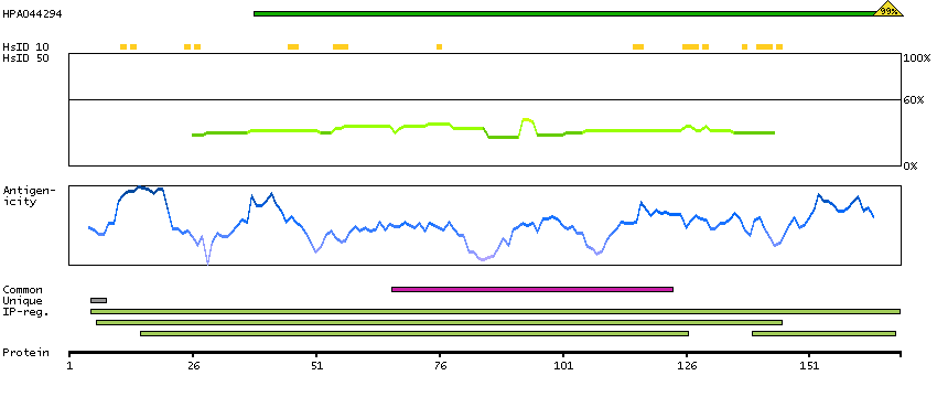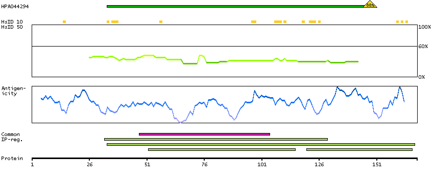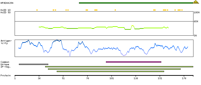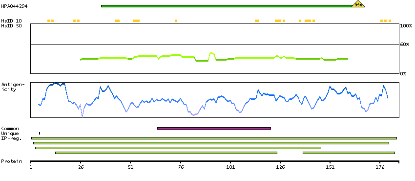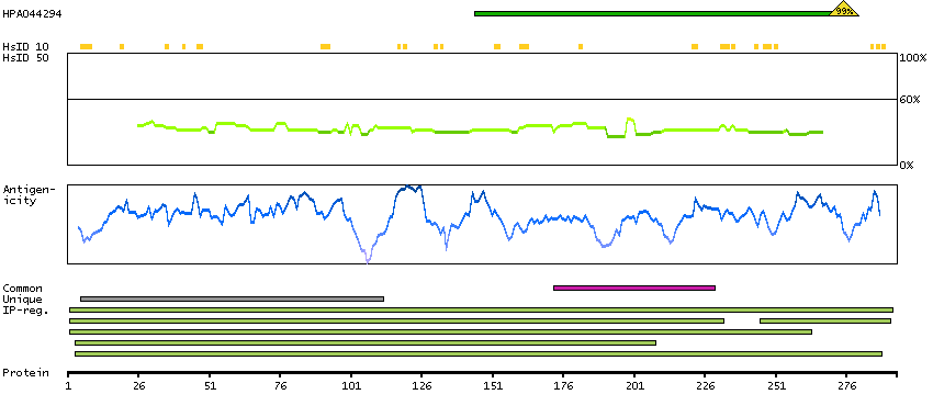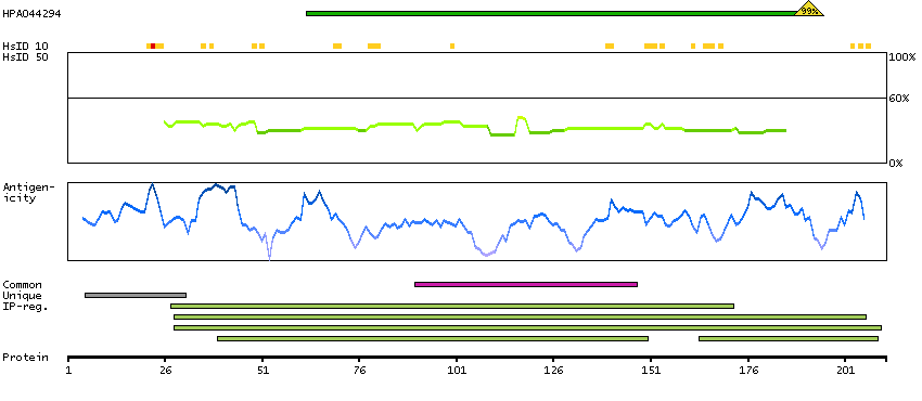Under the antigens, the maximum percent sequence identity of the protein to all other proteins from other human genes is displayed, using a sliding window of 10 aa residues (HsID 10) or 50 aa residues (HsID 50). The region with the lowest possible identity is always selected for antigen design, with a maximum identity of 60% allowed for designing a single-target antigen (read more).