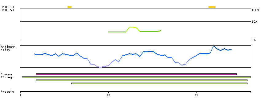 The curve in blue displays the predicted antigenicity i.e. the tendency for different regions of the protein to generate an immune response, with peak regions being predicted to be more antigenic.The curve shows average values based on a sliding window approach using an in-house propensity scale. (read more).