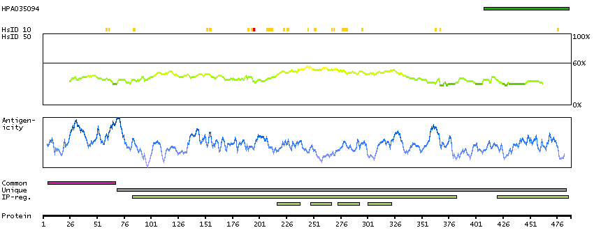 Under the antigens, the maximum percent sequence identity of the protein to all other proteins from other human genes is displayed, using a sliding window of 10 aa residues (HsID 10) or 50 aa residues (HsID 50). The region with the lowest possible identity is always selected for antigen design, with a maximum identity of 60% allowed for designing a single-target antigen (read more).