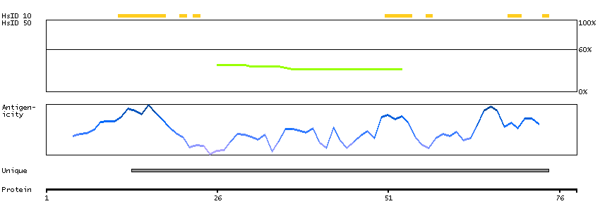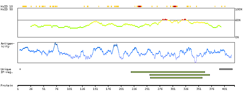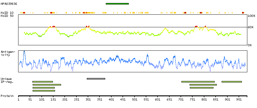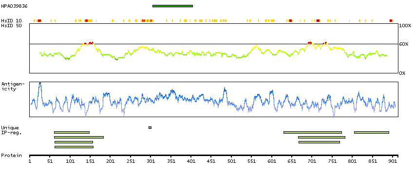 Under the antigens, the maximum percent sequence identity of the protein to all other proteins from other human genes is displayed, using a sliding window of 10 aa residues (HsID 10) or 50 aa residues (HsID 50). The region with the lowest possible identity is always selected for antigen design, with a maximum identity of 60% allowed for designing a single-target antigen (read more).