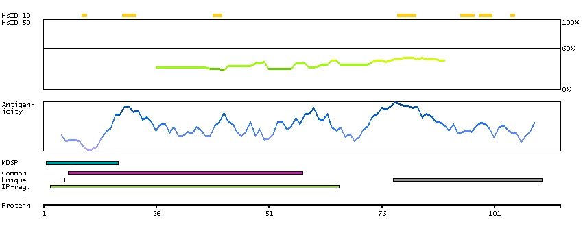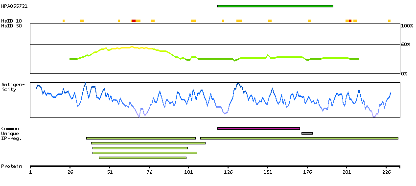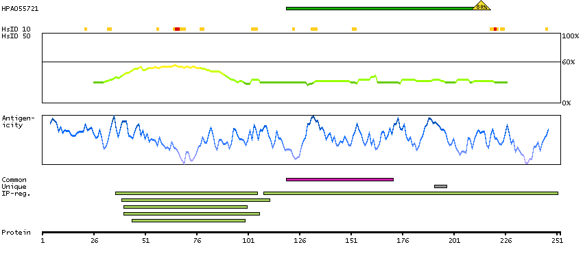 Under the antigens, the maximum percent sequence identity of the protein to all other proteins from other human genes is displayed, using a sliding window of 10 aa residues (HsID 10) or 50 aa residues (HsID 50). The region with the lowest possible identity is always selected for antigen design, with a maximum identity of 60% allowed for designing a single-target antigen (read more).