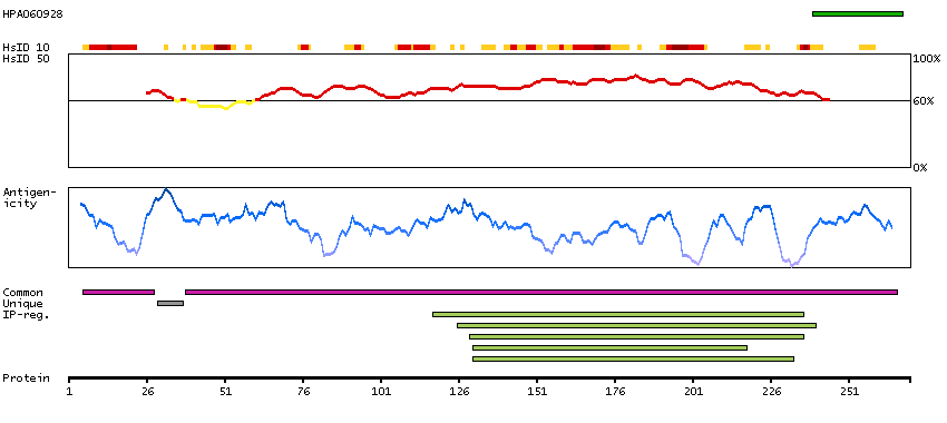 Under the antigens, the maximum percent sequence identity of the protein to all other proteins from other human genes is displayed, using a sliding window of 10 aa residues (HsID 10) or 50 aa residues (HsID 50). The region with the lowest possible identity is always selected for antigen design, with a maximum identity of 60% allowed for designing a single-target antigen (read more).