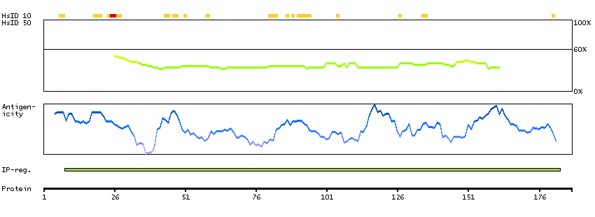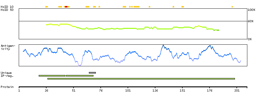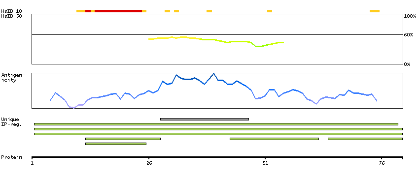 Under the antigens, the maximum percent sequence identity of the protein to all other proteins from other human genes is displayed, using a sliding window of 10 aa residues (HsID 10) or 50 aa residues (HsID 50). The region with the lowest possible identity is always selected for antigen design, with a maximum identity of 60% allowed for designing a single-target antigen (read more).