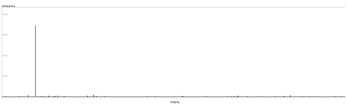 At the top of the view, the position of the antigen (identified by the corresponding HPA identifier) is shown as a green bar. A yellow triangle on the bar indicates a <100% sequence identity to the protein target.