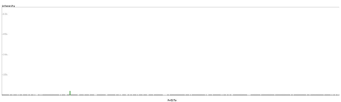 At the top of the view, the position of the antigen (identified by the corresponding HPA identifier) is shown as a green bar. A yellow triangle on the bar indicates a <100% sequence identity to the protein target.