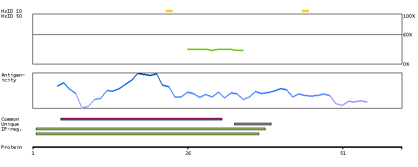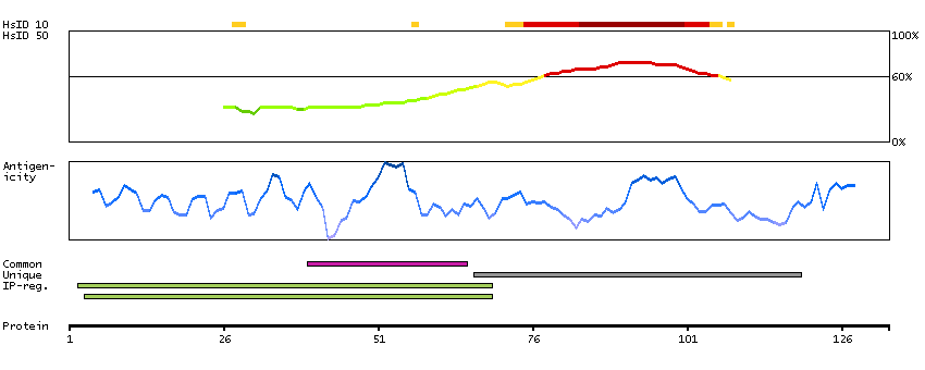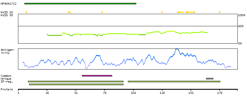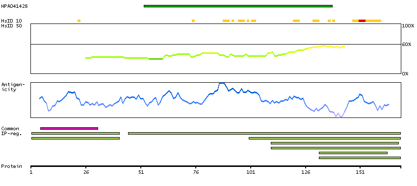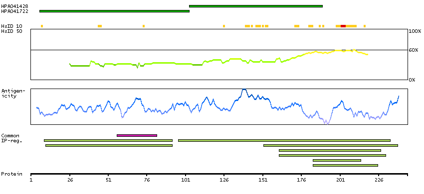 Under the antigens, the maximum percent sequence identity of the protein to all other proteins from other human genes is displayed, using a sliding window of 10 aa residues (HsID 10) or 50 aa residues (HsID 50). The region with the lowest possible identity is always selected for antigen design, with a maximum identity of 60% allowed for designing a single-target antigen (read more).