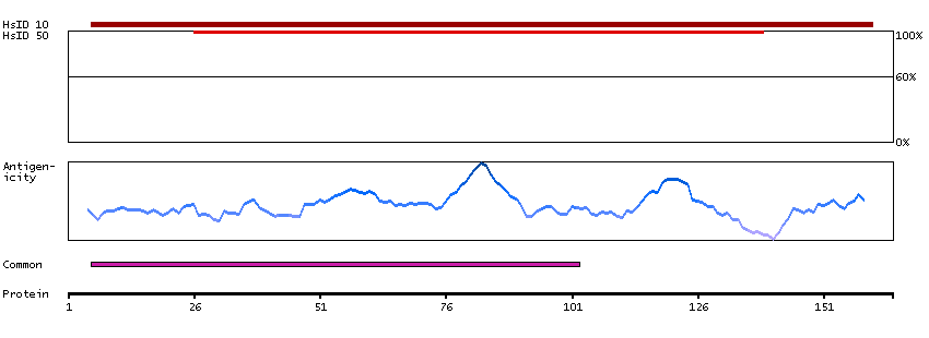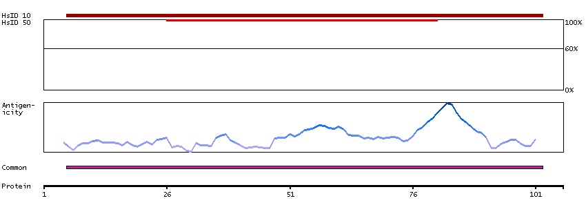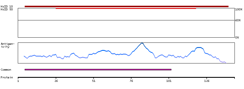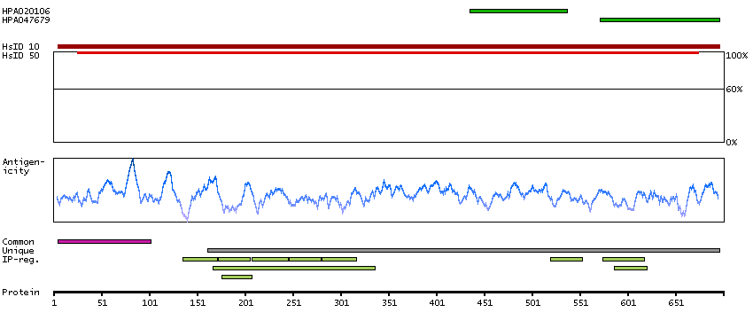 Under the antigens, the maximum percent sequence identity of the protein to all other proteins from other human genes is displayed, using a sliding window of 10 aa residues (HsID 10) or 50 aa residues (HsID 50). The region with the lowest possible identity is always selected for antigen design, with a maximum identity of 60% allowed for designing a single-target antigen (read more).