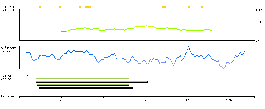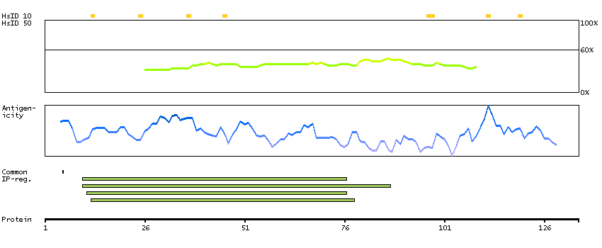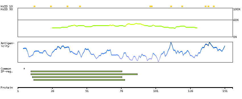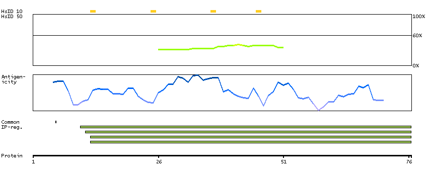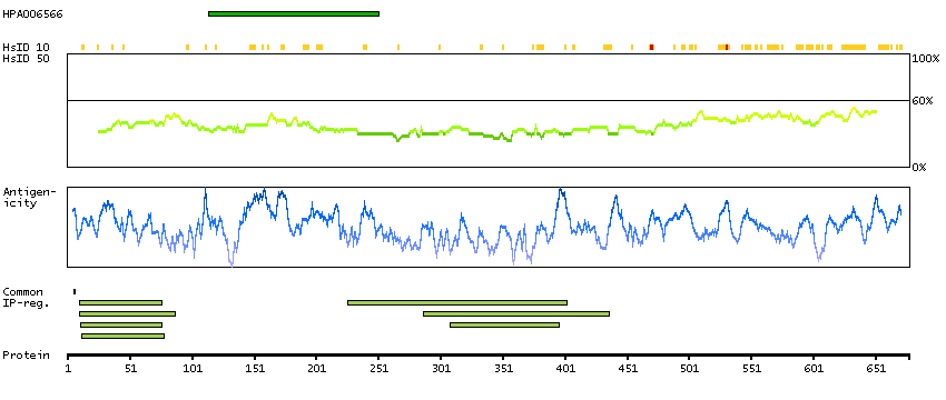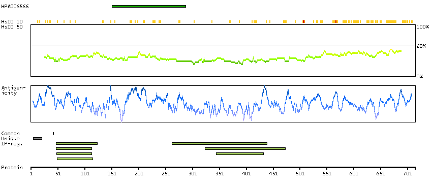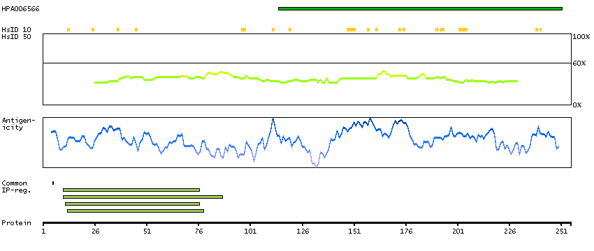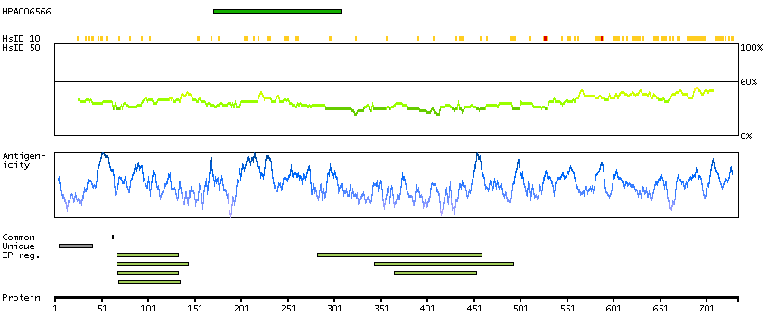 Under the antigens, the maximum percent sequence identity of the protein to all other proteins from other human genes is displayed, using a sliding window of 10 aa residues (HsID 10) or 50 aa residues (HsID 50). The region with the lowest possible identity is always selected for antigen design, with a maximum identity of 60% allowed for designing a single-target antigen (read more).