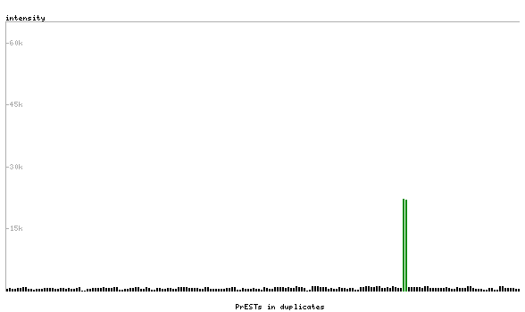 At the top of the view, the position of the antigen (identified by the corresponding HPA identifier) is shown as a green bar. A yellow triangle on the bar indicates a <100% sequence identity to the protein target.