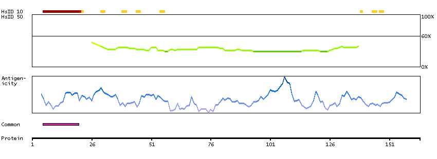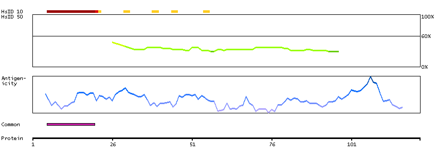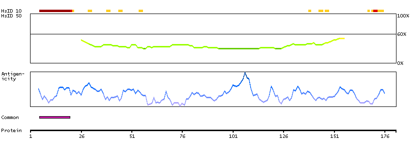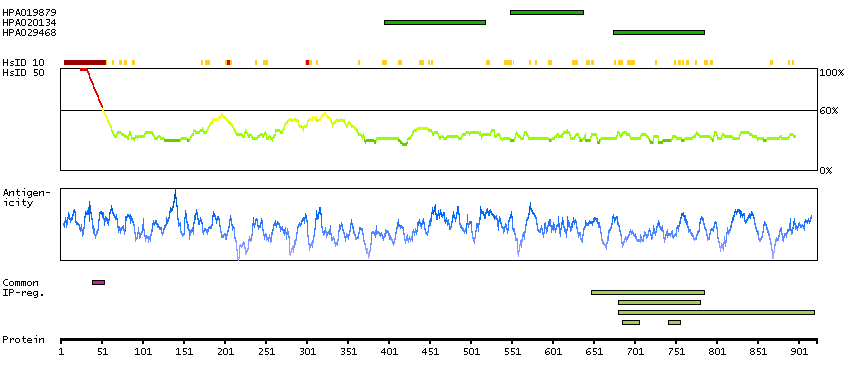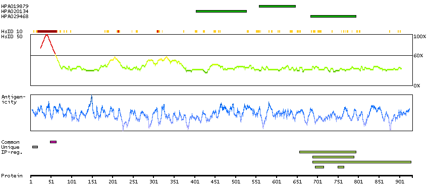 Under the antigens, the maximum percent sequence identity of the protein to all other proteins from other human genes is displayed, using a sliding window of 10 aa residues (HsID 10) or 50 aa residues (HsID 50). The region with the lowest possible identity is always selected for antigen design, with a maximum identity of 60% allowed for designing a single-target antigen (read more).
