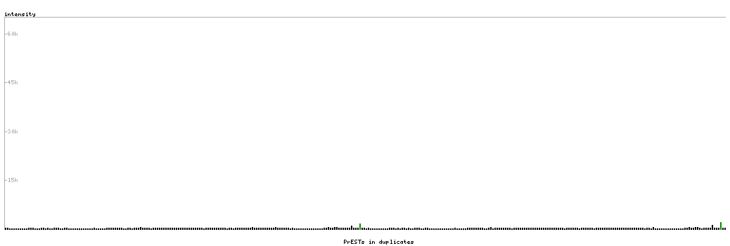 At the top of the view, the position of the antigen (identified by the corresponding HPA identifier) is shown as a green bar. A yellow triangle on the bar indicates a <100% sequence identity to the protein target.