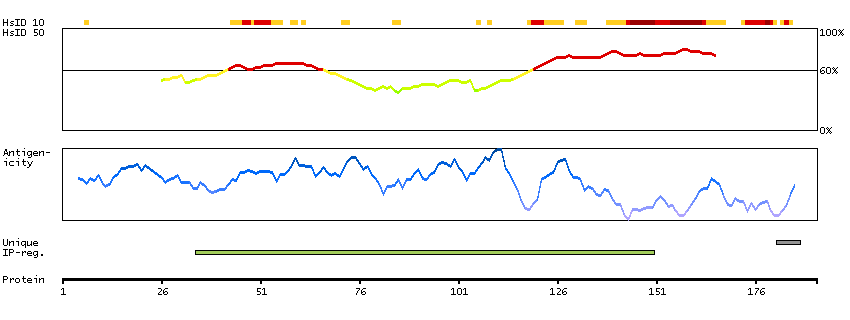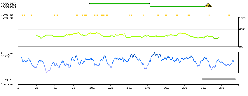 Under the antigens, the maximum percent sequence identity of the protein to all other proteins from other human genes is displayed, using a sliding window of 10 aa residues (HsID 10) or 50 aa residues (HsID 50). The region with the lowest possible identity is always selected for antigen design, with a maximum identity of 60% allowed for designing a single-target antigen (read more).