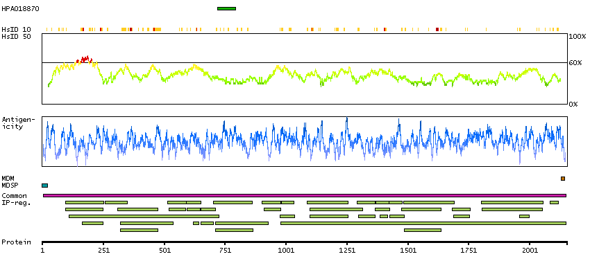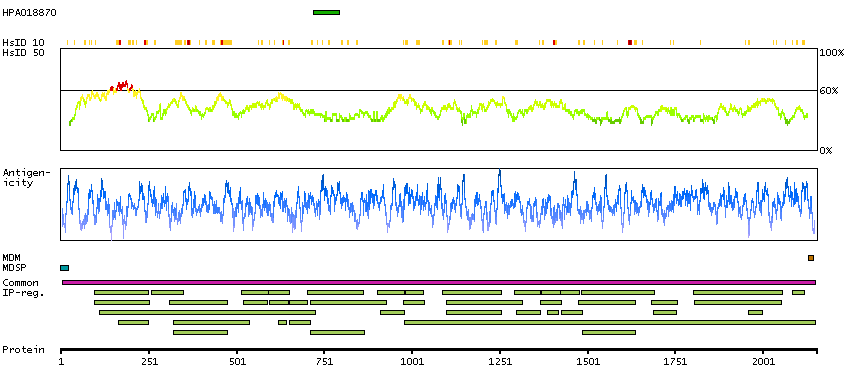 Under the antigens, the maximum percent sequence identity of the protein to all other proteins from other human genes is displayed, using a sliding window of 10 aa residues (HsID 10) or 50 aa residues (HsID 50). The region with the lowest possible identity is always selected for antigen design, with a maximum identity of 60% allowed for designing a single-target antigen (read more).