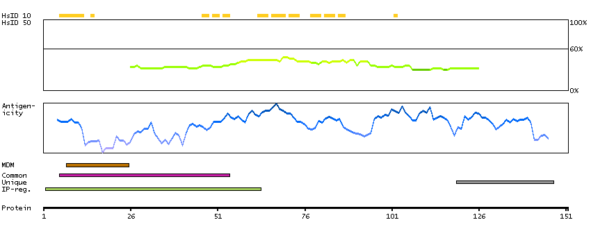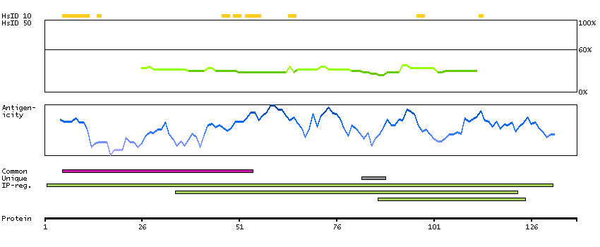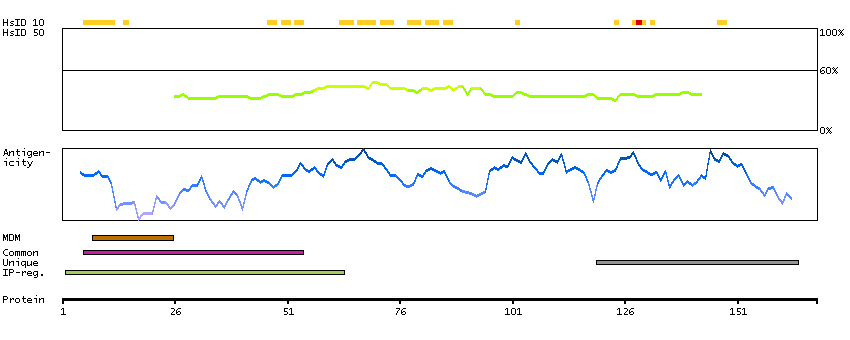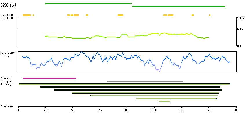 Under the antigens, the maximum percent sequence identity of the protein to all other proteins from other human genes is displayed, using a sliding window of 10 aa residues (HsID 10) or 50 aa residues (HsID 50). The region with the lowest possible identity is always selected for antigen design, with a maximum identity of 60% allowed for designing a single-target antigen (read more).