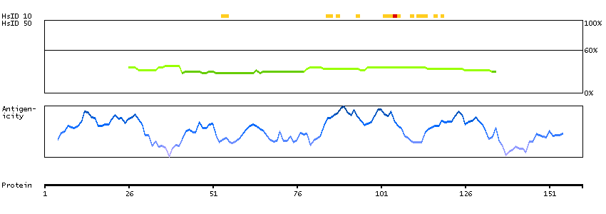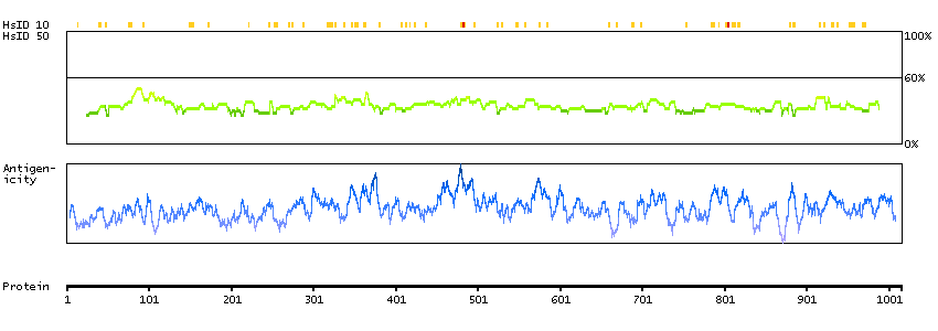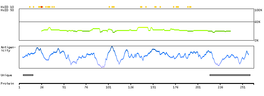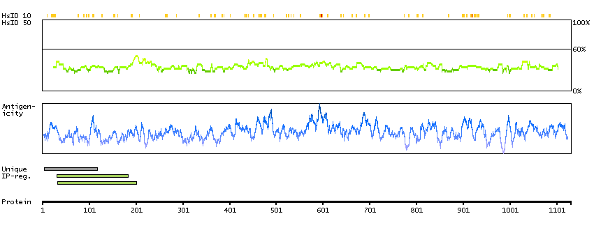Under the antigens, the maximum percent sequence identity of the protein to all other proteins from other human genes is displayed, using a sliding window of 10 aa residues (HsID 10) or 50 aa residues (HsID 50). The region with the lowest possible identity is always selected for antigen design, with a maximum identity of 60% allowed for designing a single-target antigen (read more).
