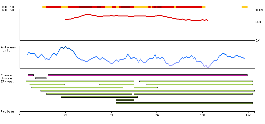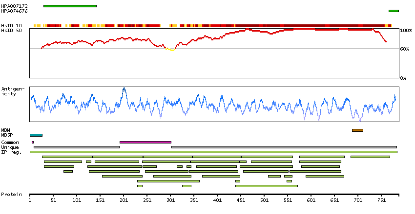 Under the antigens, the maximum percent sequence identity of the protein to all other proteins from other human genes is displayed, using a sliding window of 10 aa residues (HsID 10) or 50 aa residues (HsID 50). The region with the lowest possible identity is always selected for antigen design, with a maximum identity of 60% allowed for designing a single-target antigen (read more).
