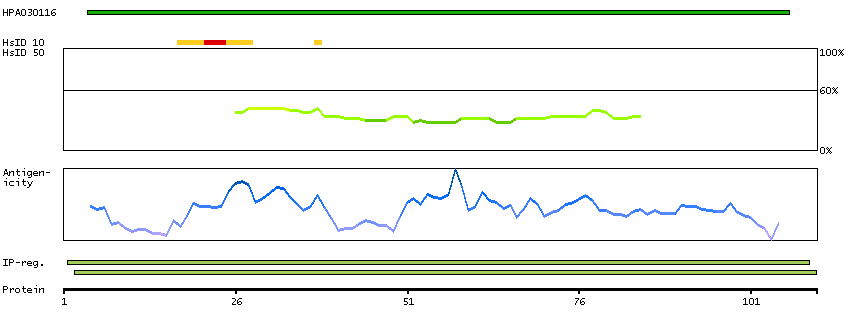 Under the antigens, the maximum percent sequence identity of the protein to all other proteins from other human genes is displayed, using a sliding window of 10 aa residues (HsID 10) or 50 aa residues (HsID 50). The region with the lowest possible identity is always selected for antigen design, with a maximum identity of 60% allowed for designing a single-target antigen (read more).