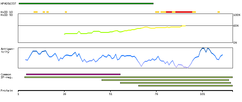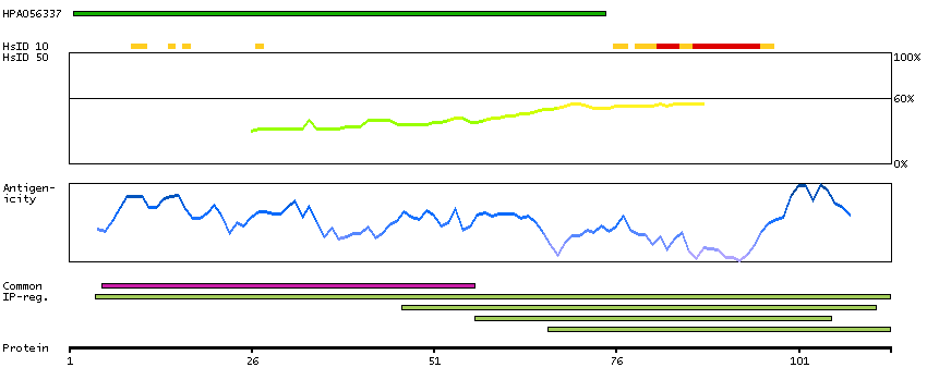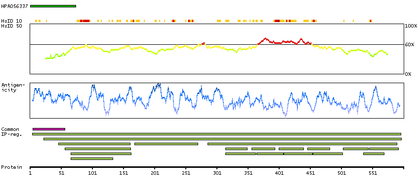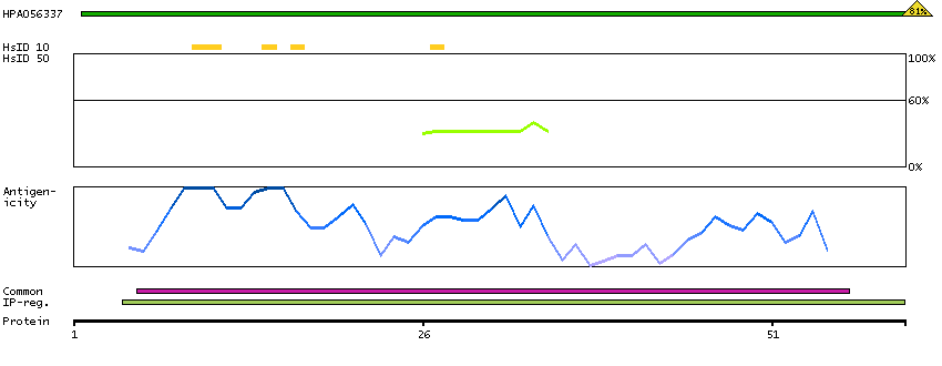 Under the antigens, the maximum percent sequence identity of the protein to all other proteins from other human genes is displayed, using a sliding window of 10 aa residues (HsID 10) or 50 aa residues (HsID 50). The region with the lowest possible identity is always selected for antigen design, with a maximum identity of 60% allowed for designing a single-target antigen (read more).