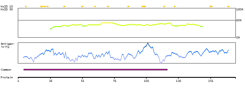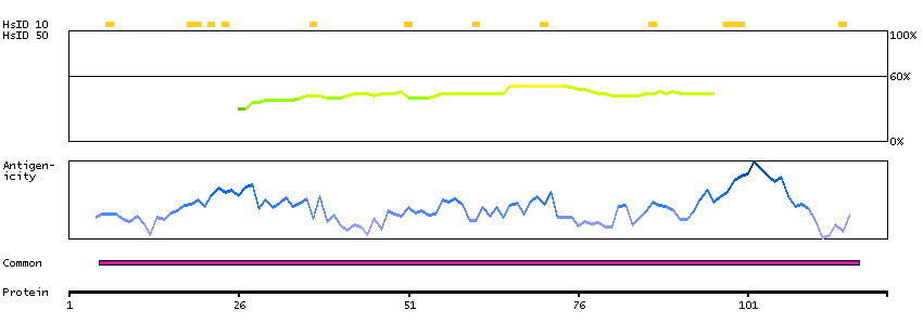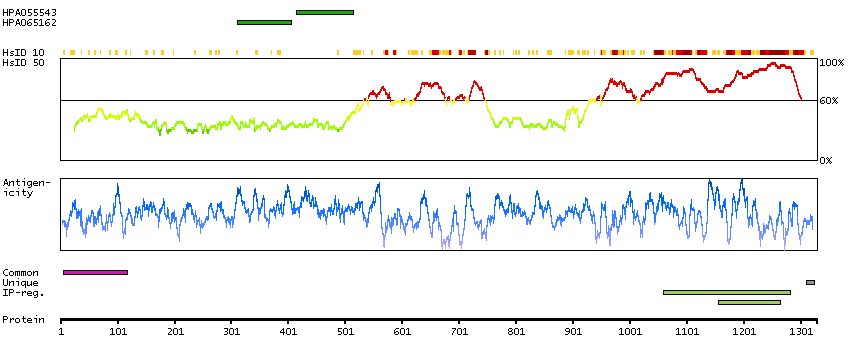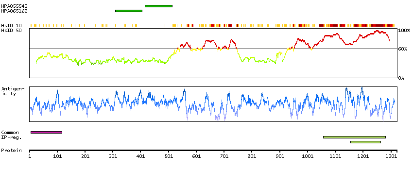 Under the antigens, the maximum percent sequence identity of the protein to all other proteins from other human genes is displayed, using a sliding window of 10 aa residues (HsID 10) or 50 aa residues (HsID 50). The region with the lowest possible identity is always selected for antigen design, with a maximum identity of 60% allowed for designing a single-target antigen (read more).