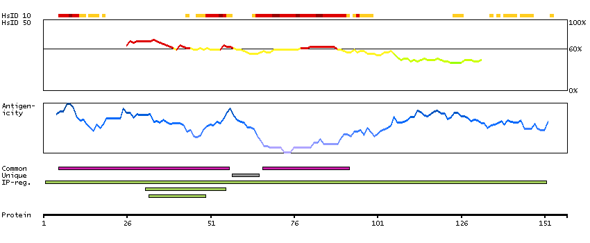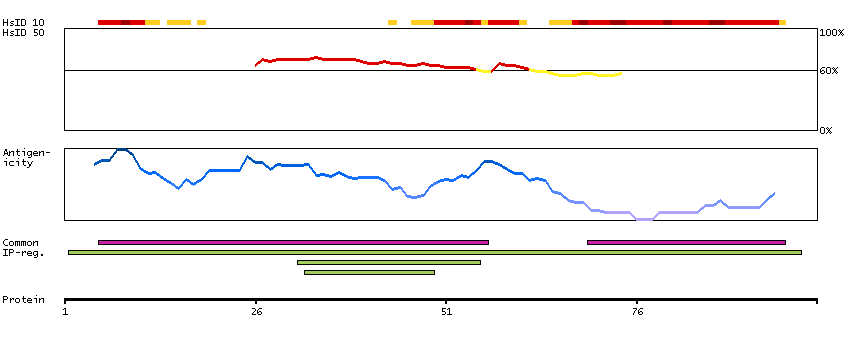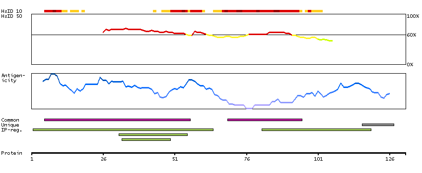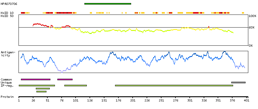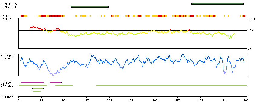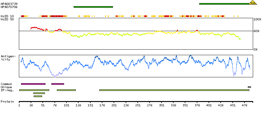 Under the antigens, the maximum percent sequence identity of the protein to all other proteins from other human genes is displayed, using a sliding window of 10 aa residues (HsID 10) or 50 aa residues (HsID 50). The region with the lowest possible identity is always selected for antigen design, with a maximum identity of 60% allowed for designing a single-target antigen (read more).