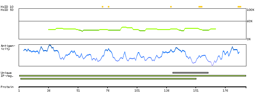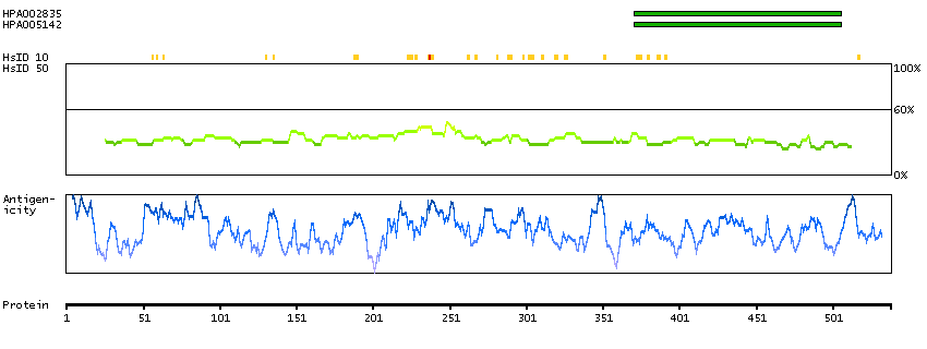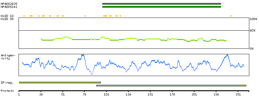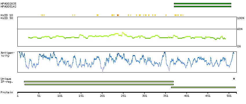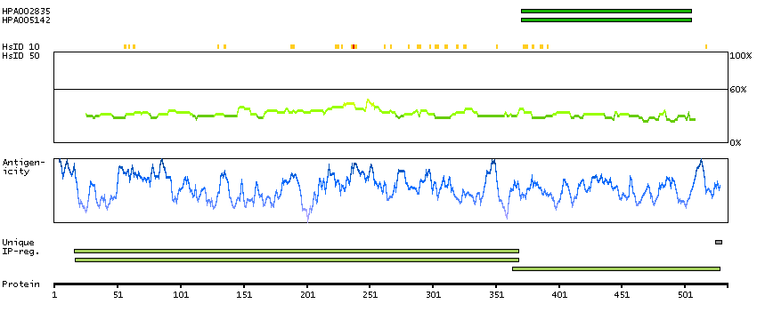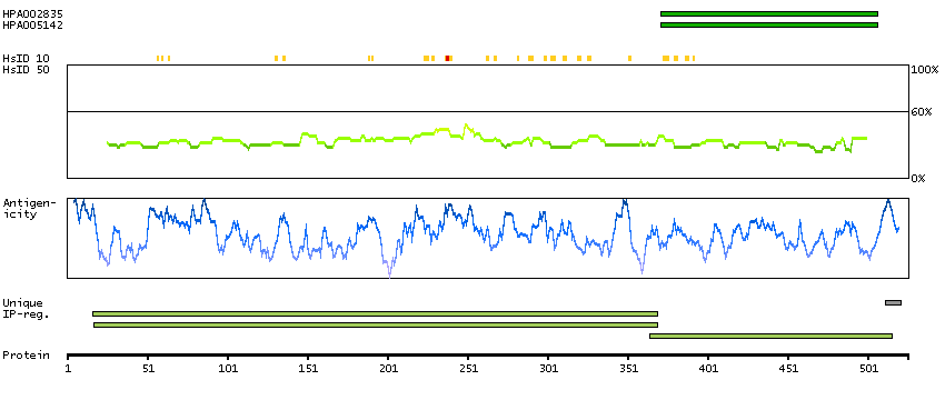 Under the antigens, the maximum percent sequence identity of the protein to all other proteins from other human genes is displayed, using a sliding window of 10 aa residues (HsID 10) or 50 aa residues (HsID 50). The region with the lowest possible identity is always selected for antigen design, with a maximum identity of 60% allowed for designing a single-target antigen (read more).