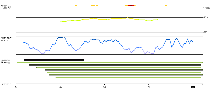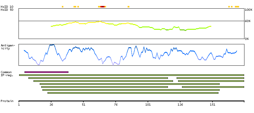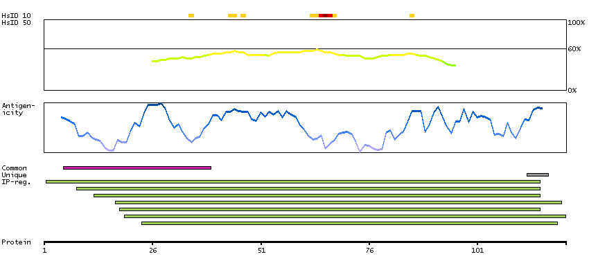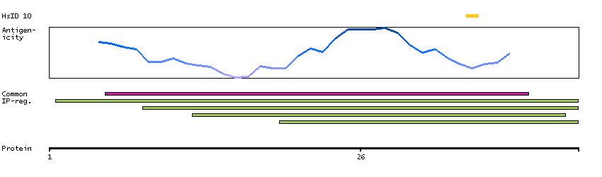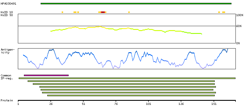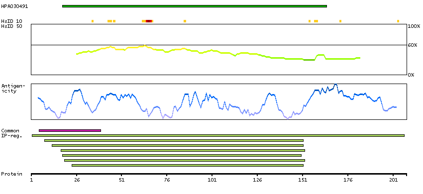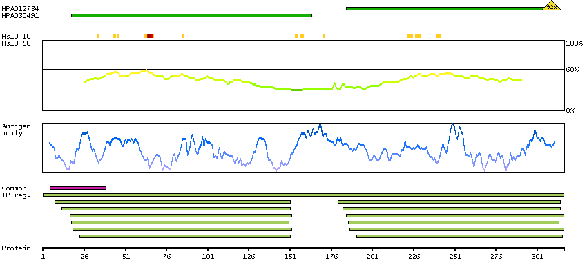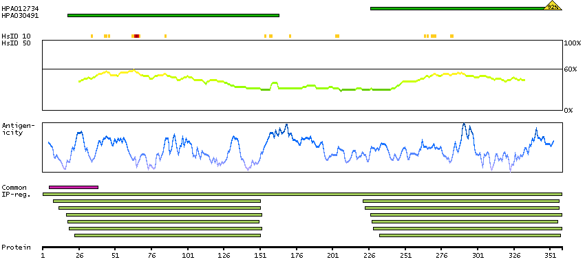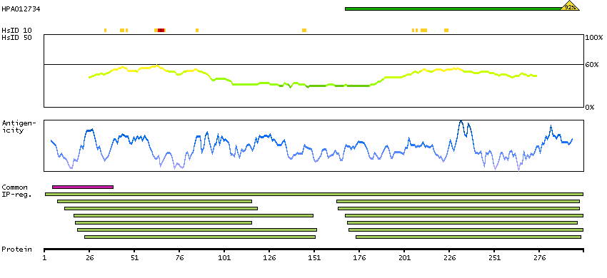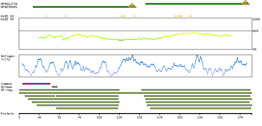 Under the antigens, the maximum percent sequence identity of the protein to all other proteins from other human genes is displayed, using a sliding window of 10 aa residues (HsID 10) or 50 aa residues (HsID 50). The region with the lowest possible identity is always selected for antigen design, with a maximum identity of 60% allowed for designing a single-target antigen (read more).