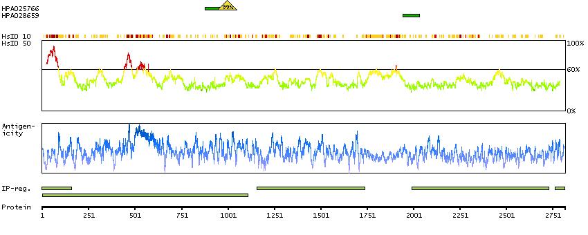 At the top of the view, the position of the antigen (identified by the corresponding HPA identifier) is shown as a green bar. A yellow triangle on the bar indicates a <100% sequence identity to the protein target.
