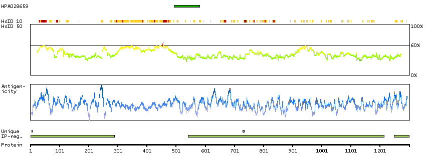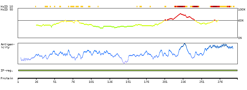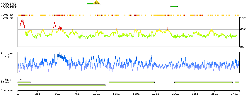 Under the antigens, the maximum percent sequence identity of the protein to all other proteins from other human genes is displayed, using a sliding window of 10 aa residues (HsID 10) or 50 aa residues (HsID 50). The region with the lowest possible identity is always selected for antigen design, with a maximum identity of 60% allowed for designing a single-target antigen (read more).