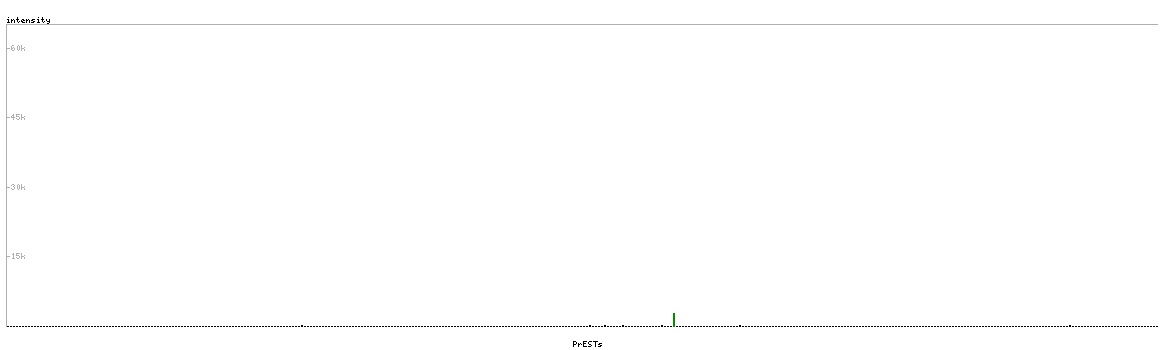 At the top of the view, the position of the antigen (identified by the corresponding HPA identifier) is shown as a green bar. A yellow triangle on the bar indicates a <100% sequence identity to the protein target.