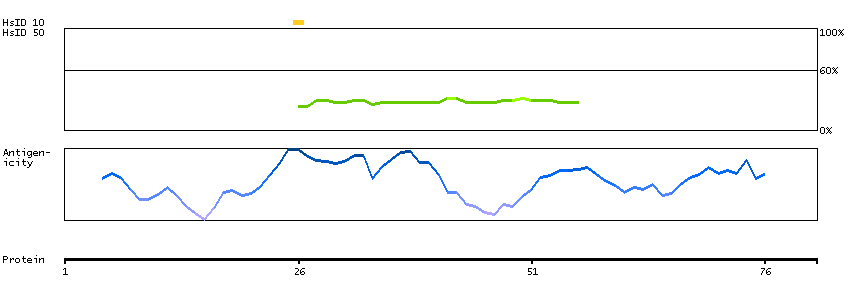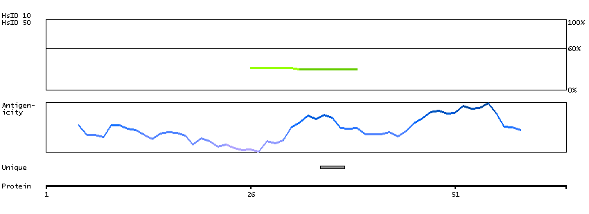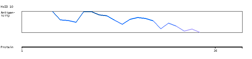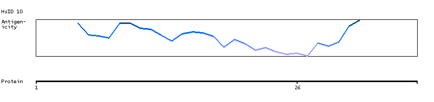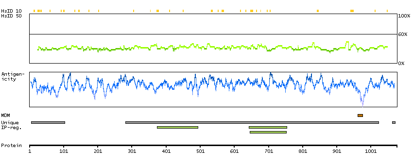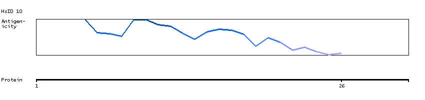 Under the antigens, the maximum percent sequence identity of the protein to all other proteins from other human genes is displayed, using a sliding window of 10 aa residues (HsID 10) or 50 aa residues (HsID 50). The region with the lowest possible identity is always selected for antigen design, with a maximum identity of 60% allowed for designing a single-target antigen (read more).
