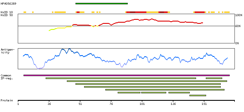 Under the antigens, the maximum percent sequence identity of the protein to all other proteins from other human genes is displayed, using a sliding window of 10 aa residues (HsID 10) or 50 aa residues (HsID 50). The region with the lowest possible identity is always selected for antigen design, with a maximum identity of 60% allowed for designing a single-target antigen (read more).