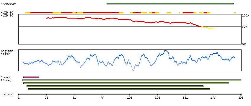Under the antigens, the maximum percent sequence identity of the protein to all other proteins from other human genes is displayed, using a sliding window of 10 aa residues (HsID 10) or 50 aa residues (HsID 50). The region with the lowest possible identity is always selected for antigen design, with a maximum identity of 60% allowed for designing a single-target antigen (read more).