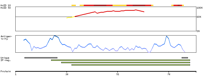 Under the antigens, the maximum percent sequence identity of the protein to all other proteins from other human genes is displayed, using a sliding window of 10 aa residues (HsID 10) or 50 aa residues (HsID 50). The region with the lowest possible identity is always selected for antigen design, with a maximum identity of 60% allowed for designing a single-target antigen (read more).