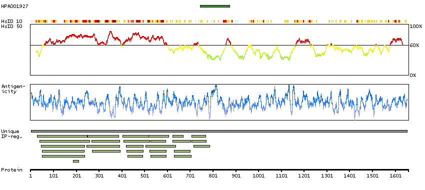Under the antigens, the maximum percent sequence identity of the protein to all other proteins from other human genes is displayed, using a sliding window of 10 aa residues (HsID 10) or 50 aa residues (HsID 50). The region with the lowest possible identity is always selected for antigen design, with a maximum identity of 60% allowed for designing a single-target antigen (read more).