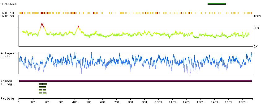 Under the antigens, the maximum percent sequence identity of the protein to all other proteins from other human genes is displayed, using a sliding window of 10 aa residues (HsID 10) or 50 aa residues (HsID 50). The region with the lowest possible identity is always selected for antigen design, with a maximum identity of 60% allowed for designing a single-target antigen (read more).
