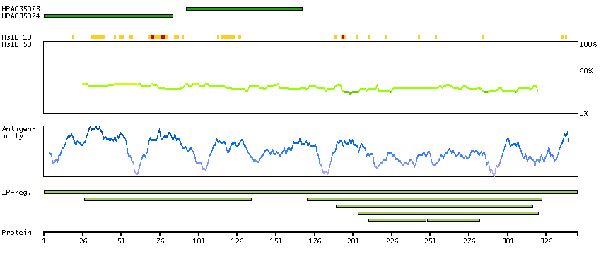 Under the antigens, the maximum percent sequence identity of the protein to all other proteins from other human genes is displayed, using a sliding window of 10 aa residues (HsID 10) or 50 aa residues (HsID 50). The region with the lowest possible identity is always selected for antigen design, with a maximum identity of 60% allowed for designing a single-target antigen (read more).