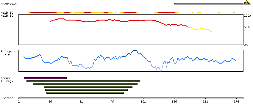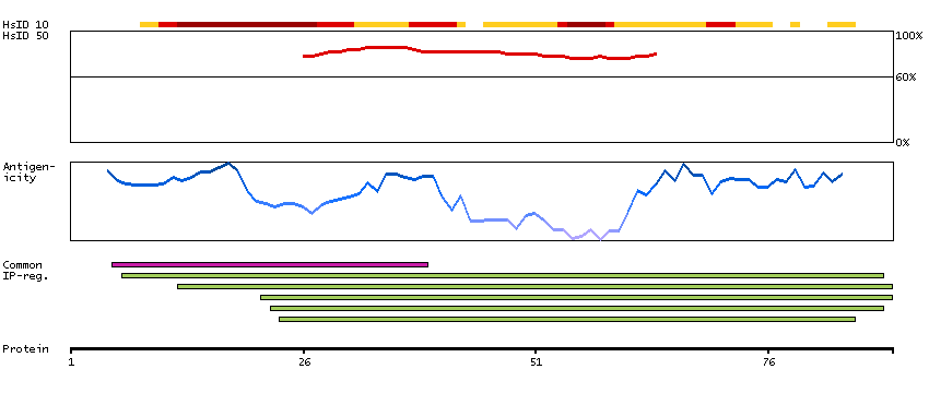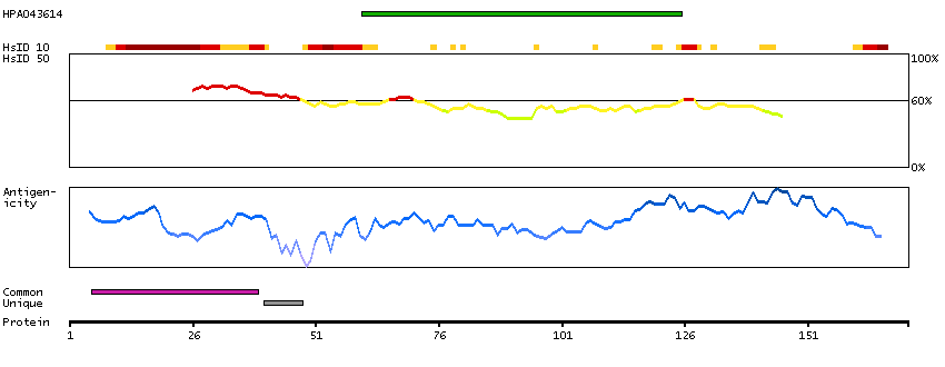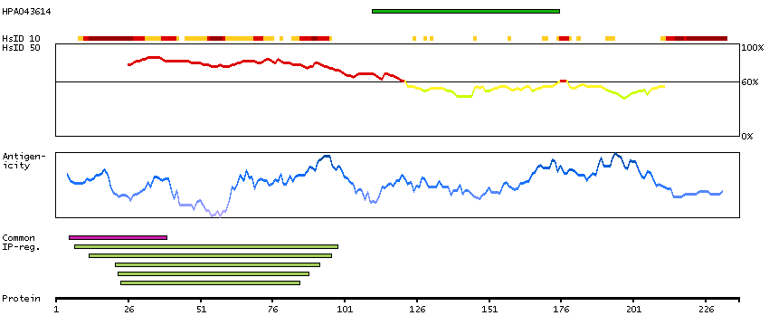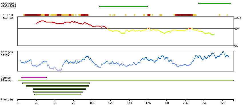 Under the antigens, the maximum percent sequence identity of the protein to all other proteins from other human genes is displayed, using a sliding window of 10 aa residues (HsID 10) or 50 aa residues (HsID 50). The region with the lowest possible identity is always selected for antigen design, with a maximum identity of 60% allowed for designing a single-target antigen (read more).