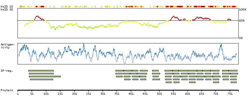 Under the antigens, the maximum percent sequence identity of the protein to all other proteins from other human genes is displayed, using a sliding window of 10 aa residues (HsID 10) or 50 aa residues (HsID 50). The region with the lowest possible identity is always selected for antigen design, with a maximum identity of 60% allowed for designing a single-target antigen (read more).