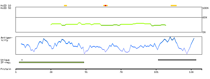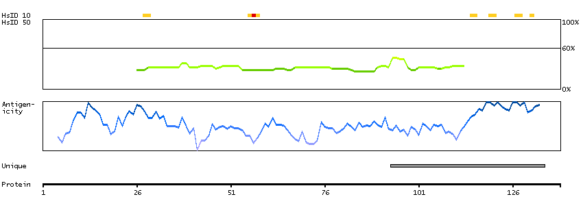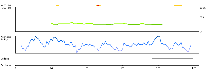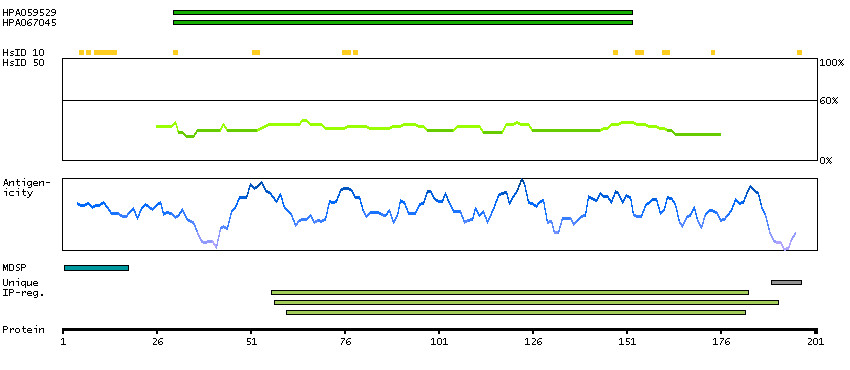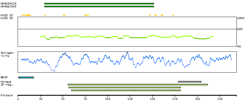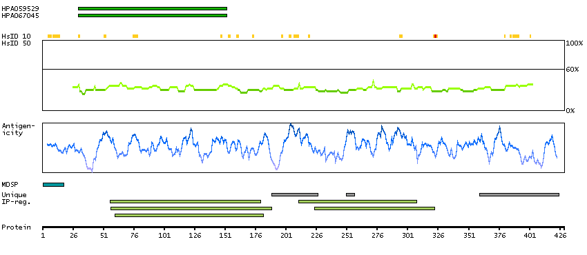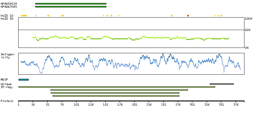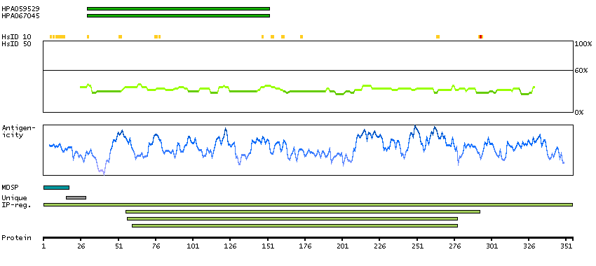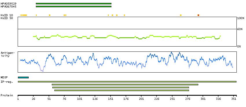 Under the antigens, the maximum percent sequence identity of the protein to all other proteins from other human genes is displayed, using a sliding window of 10 aa residues (HsID 10) or 50 aa residues (HsID 50). The region with the lowest possible identity is always selected for antigen design, with a maximum identity of 60% allowed for designing a single-target antigen (read more).