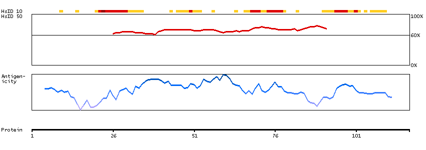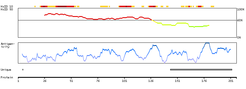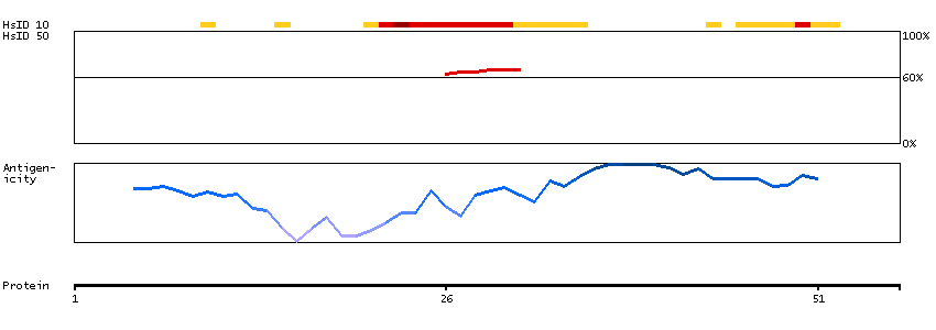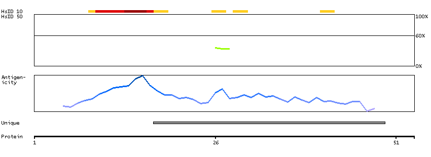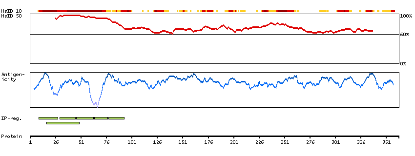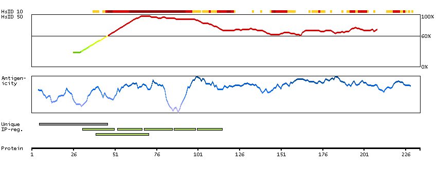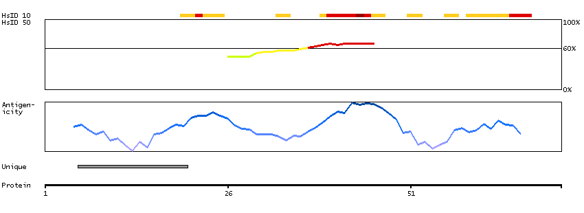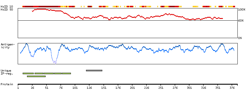 Under the antigens, the maximum percent sequence identity of the protein to all other proteins from other human genes is displayed, using a sliding window of 10 aa residues (HsID 10) or 50 aa residues (HsID 50). The region with the lowest possible identity is always selected for antigen design, with a maximum identity of 60% allowed for designing a single-target antigen (read more).