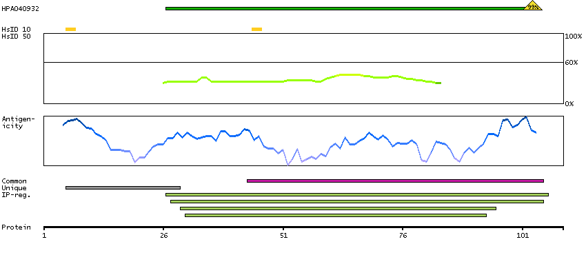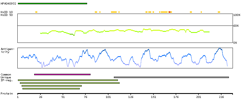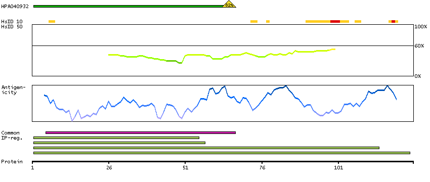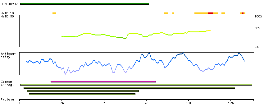 Under the antigens, the maximum percent sequence identity of the protein to all other proteins from other human genes is displayed, using a sliding window of 10 aa residues (HsID 10) or 50 aa residues (HsID 50). The region with the lowest possible identity is always selected for antigen design, with a maximum identity of 60% allowed for designing a single-target antigen (read more).