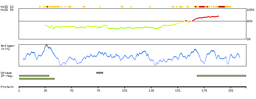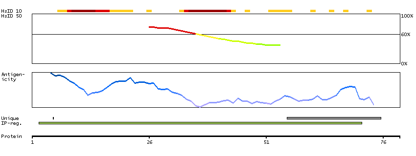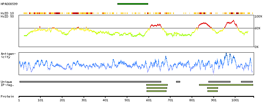Under the antigens, the maximum percent sequence identity of the protein to all other proteins from other human genes is displayed, using a sliding window of 10 aa residues (HsID 10) or 50 aa residues (HsID 50). The region with the lowest possible identity is always selected for antigen design, with a maximum identity of 60% allowed for designing a single-target antigen (read more).